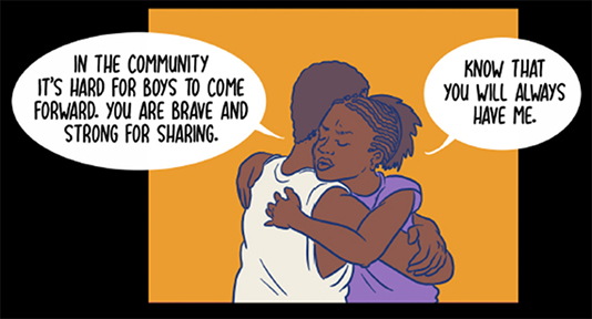 Participatory comics are a low-cost, youth-friendly, and scalable way to increase health promotion and literacy. Survivor-informed comic books were used to advance sexual and gender-based violence prevention and care among refugee youth in Uganda. Comic scenarios were informed by the narratives of refugee youth, elders, and healthcare providers. Participants were presented with blank panels to fill out as they reflected on their experiences and created solutions.