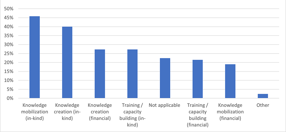 “Which, if any, aspects of your research program are supported by partners – either through in-kind or financial support?” (n=205) (Top 8 responses shown)