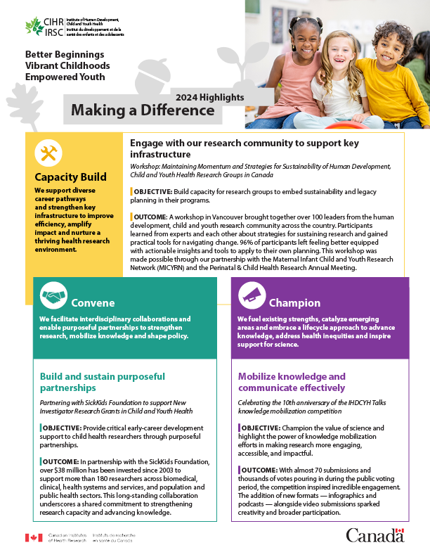 Outcome: In partnership with the SickKids Foundation, over $38 million has been invested since 2003 to support more than 180 researchers across biomedical, clinical, health systems and services, and population and public health sectors. This long-standing collaboration underscores a shared commitment to strengthening research capacity and advancing knowledge.