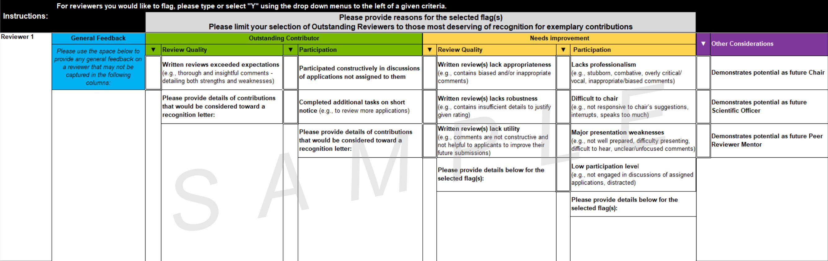 1. Written reviews exceeded expectations (e.g., thorough and insightful comments - detailing both strengths and weaknesses - that will significantly aid both the applicant and other reviewers)