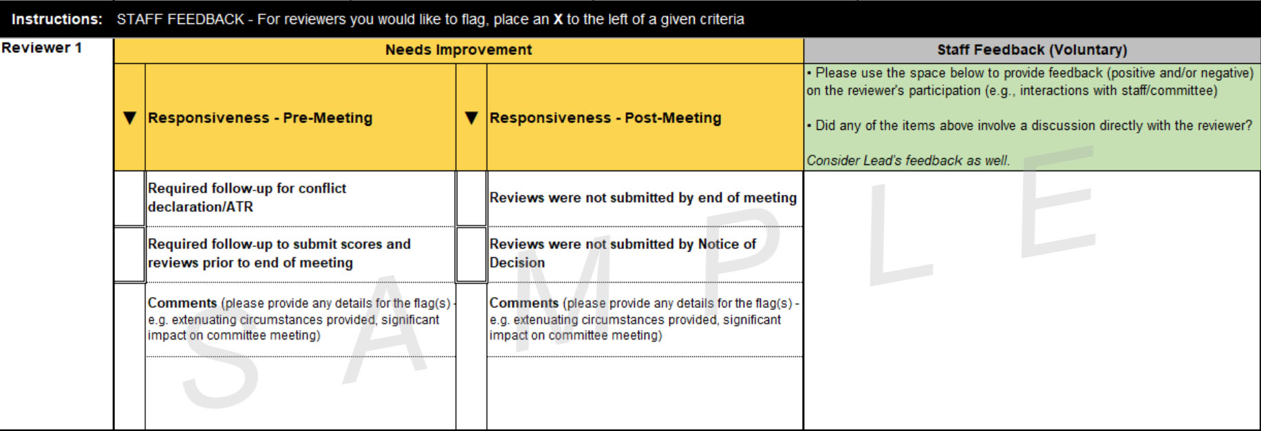 This copy of the Reviewer Quality Feedback Form and it's interpretation guidelines are provided as information only. If you are a Chair or Scientific Officer, you will receive details about how to complete and submit the information.