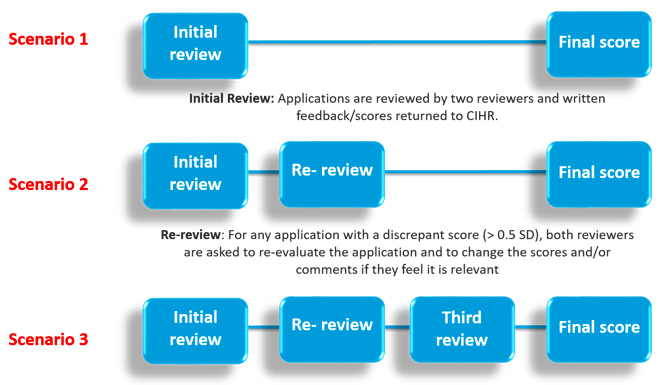 | 3. Third Review | Any application that still has a discrepant score following the re-review process, CIHR asks a third, impartial reviewer to review the application and assign a score. |