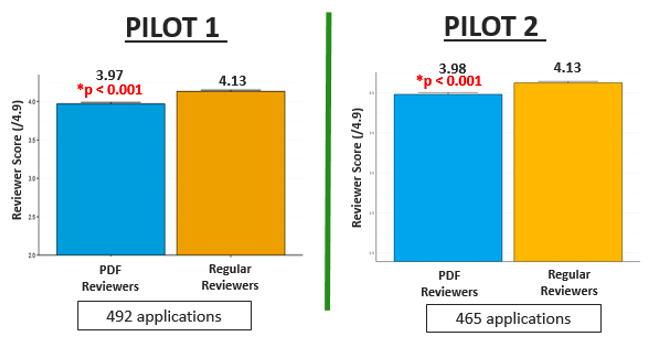 - In pilot 2, of the 465 applications scored by PDF-Regular reviewer pairs, PDF reviewers awarded an average score of 3.98, while Regular reviewers awarded an average score of 4.13. The difference between the PDF reviewer and Regular reviewer scores was 0.15, statistically significant (p < 0.001).