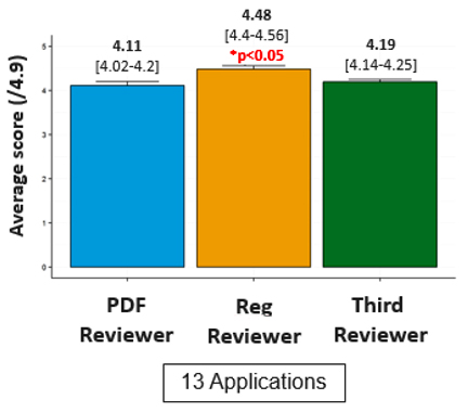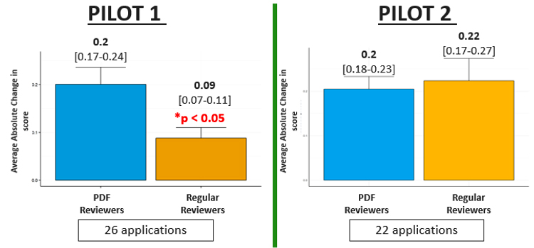 - Pilot 2: Of the 22 applications that were commonly re-reviewed by PDF and Regular reviewers, PDFs altered their initial score to a similar degree as regular reviewers (average absolute change 0.2 for PDFs and 0.22 for RR). No significant difference was observed between the initial average score and the re-review score for either reviewer type.