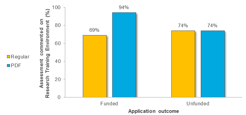 Number and percentage of assessments provided by Regular versus PDF reviewers that commented on the “Research Training Environment” criterion across funded and unfunded applications.