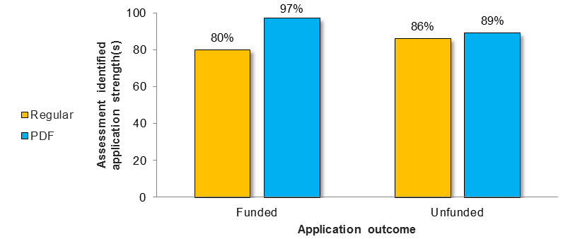 Figure 12 shows the percentage of Regular versus PDF assessments identifying application strength(s) across funded and unfunded applications.