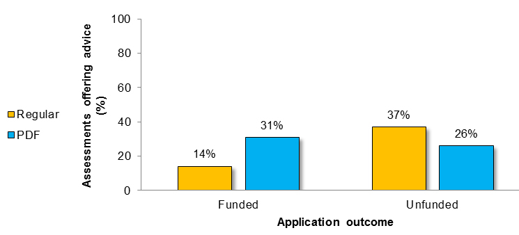 Figure 14 shows the percentage of Regular versus PDF assessments that offered advice to the applicant across funded and unfunded applications.