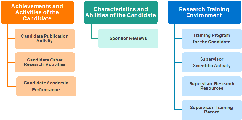 - Research training environment is assessed by four sub-criteria. i.e. 1) training program of the candidate, 2) supervisor scientific activity, 3) supervisor research resources and 4) supervisor training record.