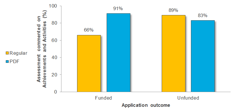 Number and percentage of assessments provided by Regular versus PDF reviewers that commented on the “Achievements and Activities of Candidate” criterion across funded and unfunded applications.