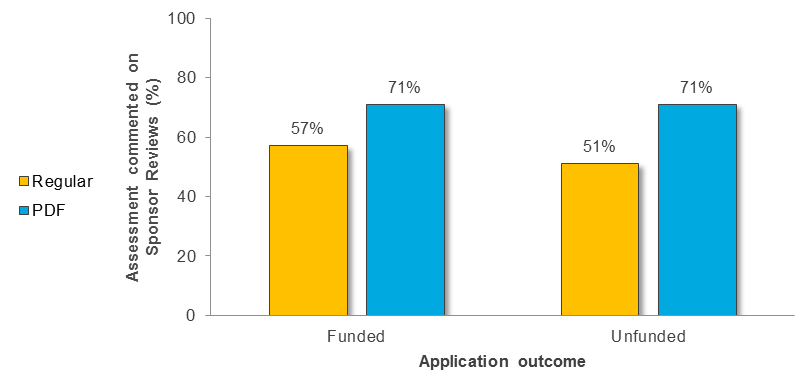 Funded Applications Unfunded Applications Regular Assessment (N=35) PDF Assessment (N=35) Regular Assessment (N=35) PDF Assessment (N=35) Number of Assessments 23 32 31 29 Percent of Total Assessments 66% 91% 89% 83% Figure 10 shows the percentage of Regular versus PDF assessments that commented on the “Sponsor Reviews” criterion across funded and unfunded applications.