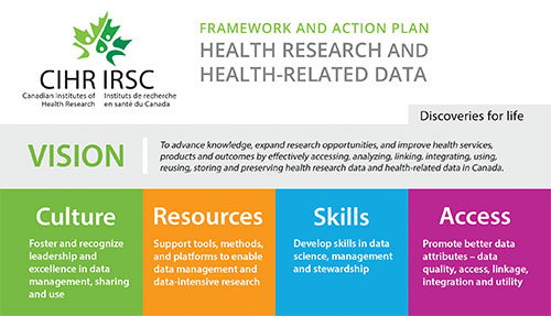 Given CIHR's active involvement in a multitude of data-related endeavours, a framework has been developed to ensure a cohesive and consistent approach. The CIHR Health Research and Health-Related Data Framework and Action Plan (the Framework) provides a shared vision, guiding principles, desired outcomes, objectives and actions to guide current and future data-related activities so as to maximize impact.