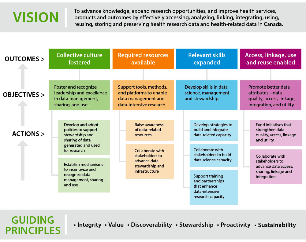 To advance knowledge, expand research opportunities, and improve health services, products and outcomes by effectively accessing, analyzing, linking, integrating, using, reusing, storing and preserving health research data and health-related data in Canada.