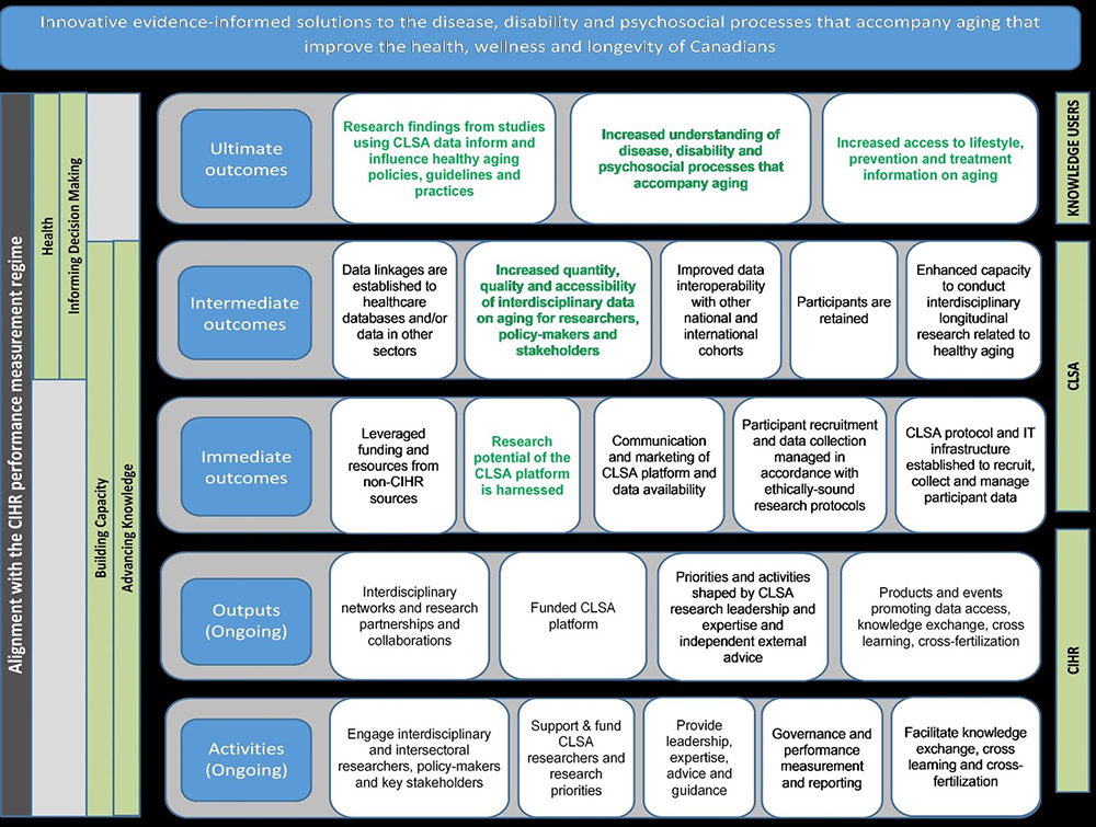 The CLSA’s objectives are aligned with CIHR’s mandate of supporting initiatives that will lead to the improved health of Canadians as well as a strengthened healthcare system. The CIHR Act (S.C. 2000, c6) aims among other objectives, at “addressing emerging health opportunities, threats and challenges and accelerating the discovery of cures and treatments and improvements to health care, prevention and wellness strategies.” Finally, the CLSA is aligned with Government of Canada priorities to promote healthy aging and the advancement of pan-Canadian collaboration on health innovation as outlined in Ministerial mandate letters for the Minister of Seniors and Minister of Health, respectively.