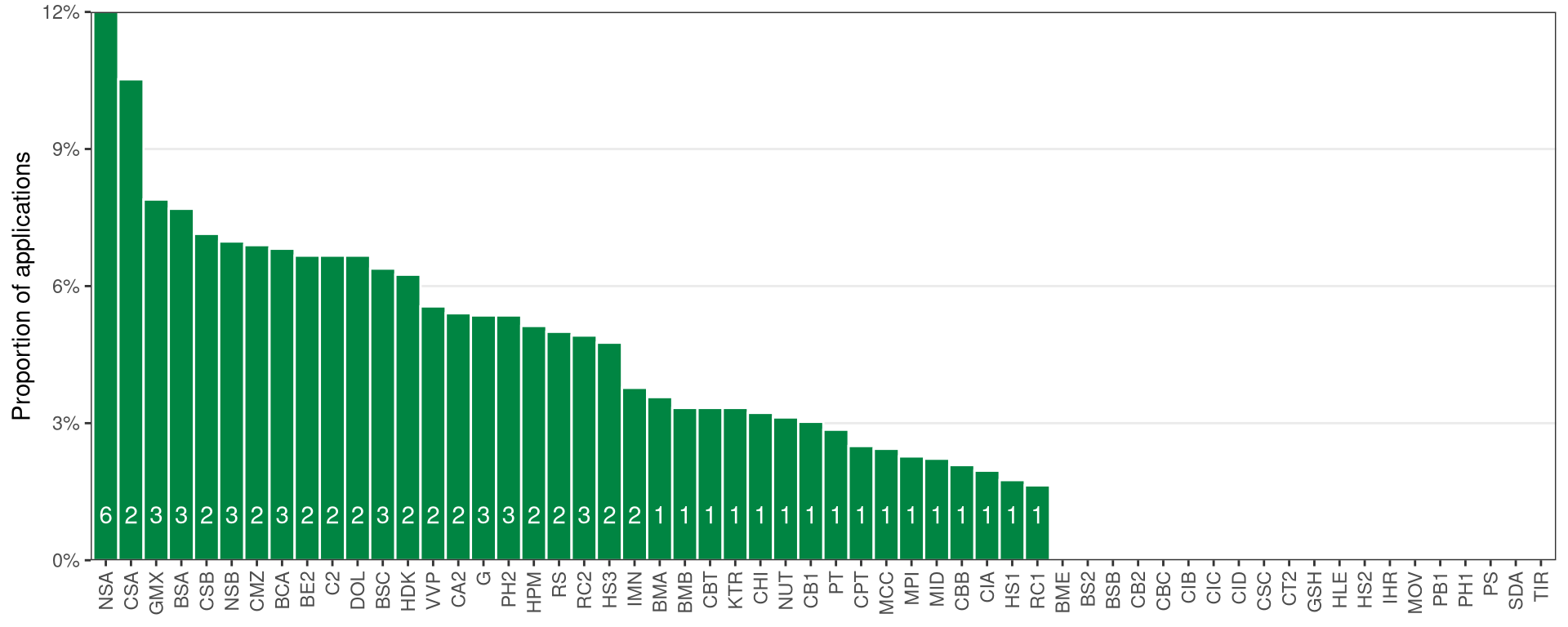 | PRC | Proportion of applications from past Foundation grant holders (%) | Number of past Foundation grant holder applications |