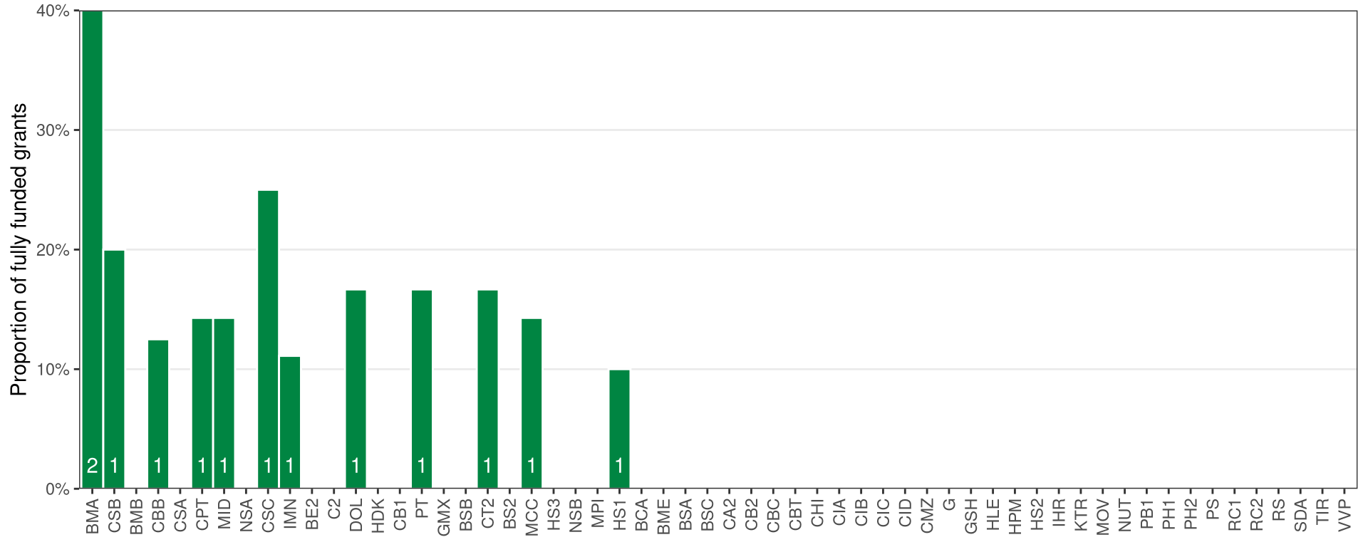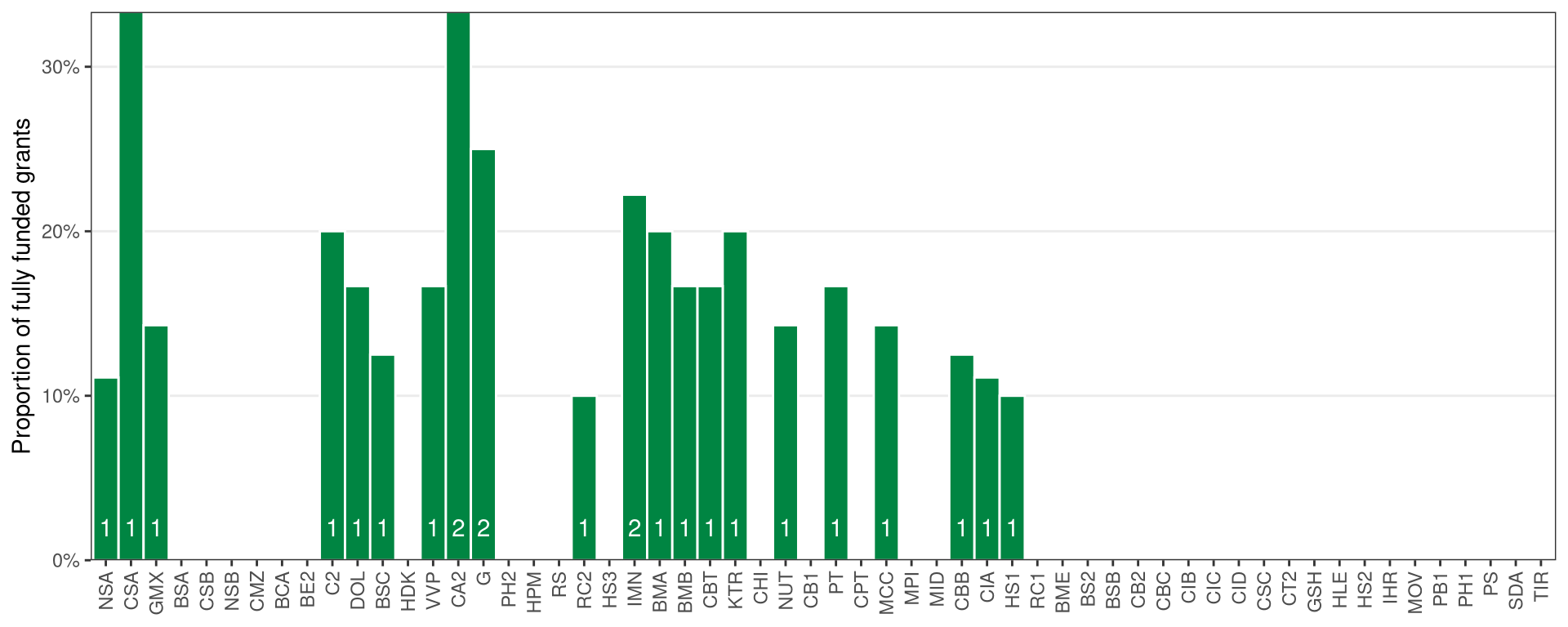 | PRC | Proportion of fully funded grants awarded to past Foundation grant holders (%) | Number of fully funded past Foundation grant holders |