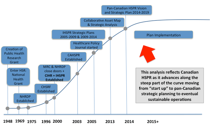 The past ten years have been an important maturation period for health services and policy research in Canada. Figure 1 illustrates the emergence of health services and policy research and its trajectory leading up to the present. The origins stem from the National Health Research and Development Program within Health Canada, the emergence of the Canadian Health Services Research Foundation (now Canadian Foundation for Health Care Improvement) and the emergence of the Canadian Institutes of Health Research (CIHR) and the Institute for Health Services and Policy Research (IHSPR) in 2000.