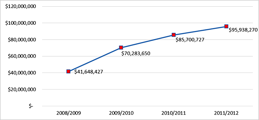 - Figure 5: Trend in total health services and policy research investment (2008/09-2011/12)