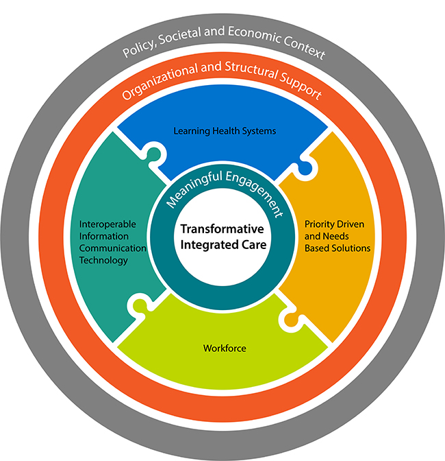 Informed by a literature scan and engagement with patients, providers, researchers and decision-makers, this image illustrates elements essential to transformative integrated care. Broadly categorized by theme, these elements play a significant role for stakeholders across all levels of the health care system. The image illustrates micro-level elements (e.g., individual level) closest to the core, spanning outward to macro-level elements (e.g., organizational or system level).