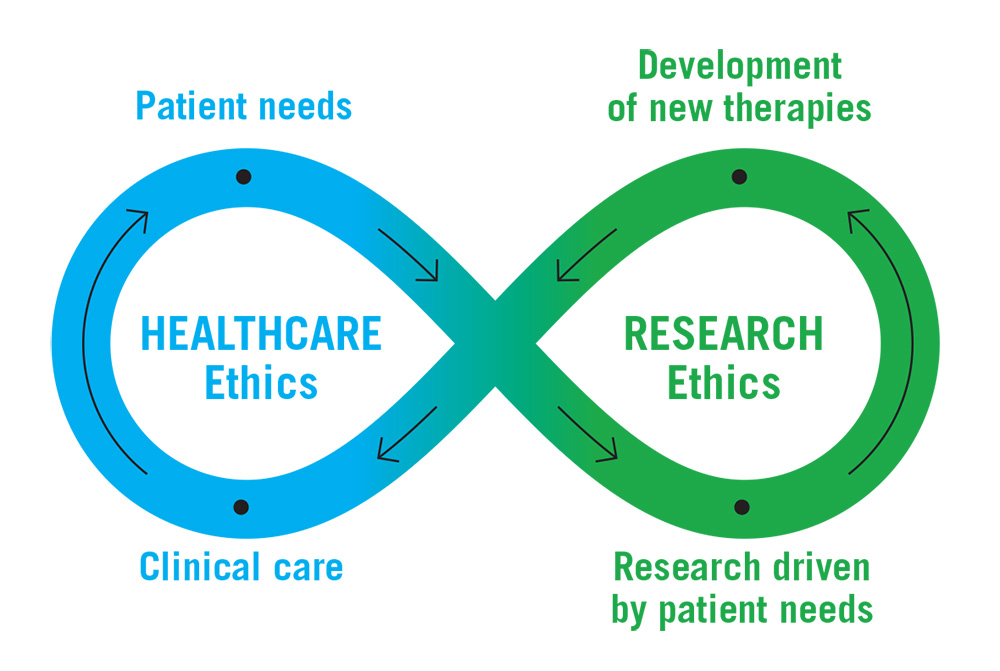 Infinity loop with arrows directing the continuous flow. On the left side is Healthcare Ethics with points on the loop labelled "Patient needs" and "Clinical care". On the right side is Research Ethics with points on the loop labelled "Development of new therapies" and "Research driven by patient needs".