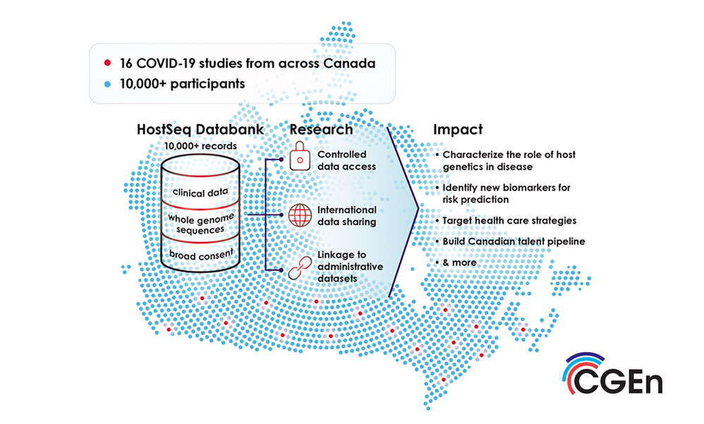 Led by CGEn, Canada’s national platform for genome sequencing and analysis, HostSeq brought together 16 clinical research studies to sequence the genomes and gather clinical information for more than 10,000 Canadians to help understand host genetic contributions to COVID-19 and other health issues. HostSeq data is being used to support research into cancer, autism spectrum disorder, cardiac health and more.