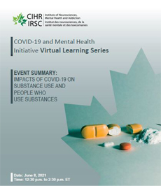On June 8, 2021, CIHR-INMHA hosted the second event of the COVID-19 and Mental Health (CMH) Initiative Virtual Learning Series: Impacts of COVID-19 on substance use and people who use substances, bringing together researchers, policy makers, community members, people with lived and living expertise, partners and other knowledge users.
