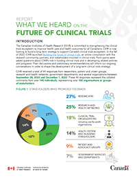 The Canadian Institutes of Health Research (CIHR) is committed to strengthening the clinical trials ecosystem to improve health care and health outcomes for all Canadians. CIHR is now looking to build a long-term strategy to support Canada’s clinical trials ecosystem. In the fall of 2022, CIHR launched Building the future of clinical trials, an online consultation with the research community, partners, and stakeholders involved in clinical trials. Participants were asked questions about CIHR’s role in funding clinical trials and in developing related policies and programs. Their discussions and preliminary recommendations will inform our ongoing conversations in order to shape the development of a long-term clinical trials strategy.
