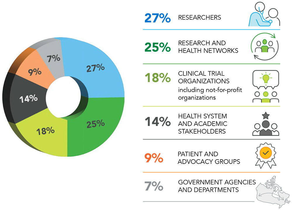 These 44 responses represent the collated comments from over 140 individuals, representing over 100 organizations or groups of stakeholders. Of these 44 responses: 27% came from researchers, 25% came from research and health networks, 18% came from clinical trial organizations including enabling and not-for-profit organizations, 14% came from health system and academic stakeholders, 9% came from patient and advocacy groups and 7% came from the government agencies and departments.