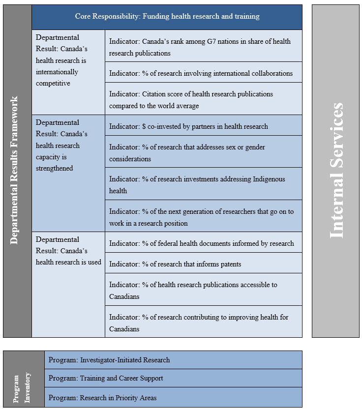 The Canadian Institutes of Health Research Departmental Results Framework and Program Inventory of record for 2018–19 are shown below.
