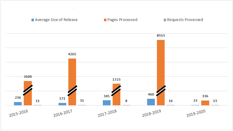 While the number of requests received is comparable to the previous year at 18, the average number of pages released per request decreased significantly, from 460 in 2018-2019 to 23 in 2019-2020, despite the fact that the subject matter of the requests remained similar to previous years. This decline in the size of records released, however, hides the fact that the requests received were highly complex in nature, requiring a high level of effort to process. Furthermore, the requests that needed to be carried over for processing in the 2020-2021 reporting period amount to over 8,000 pages. As illustrated in the graph below, the average number of pages released in 2019-2020 was 23 pages compared to an average of 460 pages in 2018-2019 and 345 pages in 2017-2018.