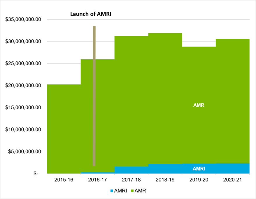 AMRI grant recipients are expected to complete the end of grant report within 18 months of grant expiry. The end of grant report assesses recipients’ outputs and outcomes during the tenure of the grant in terms of numbers of collaborations, trainees involved in the project, and knowledge products (e.g., journal articles, patents).