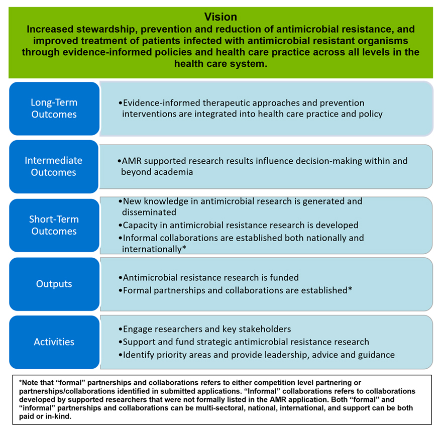 The vision of AMRI is for Canada to increase stewardship, prevention and reduction of AMR and improve treatment of patients infected with antimicrobial resistant organisms through evidence-informed policies and health care practice across all levels in the health care system. Broadly, the AMRI aims to improve treatment, care, and quality of life for patients infected with AMR organisms and reduce the inappropriate consumption of antibiotics.