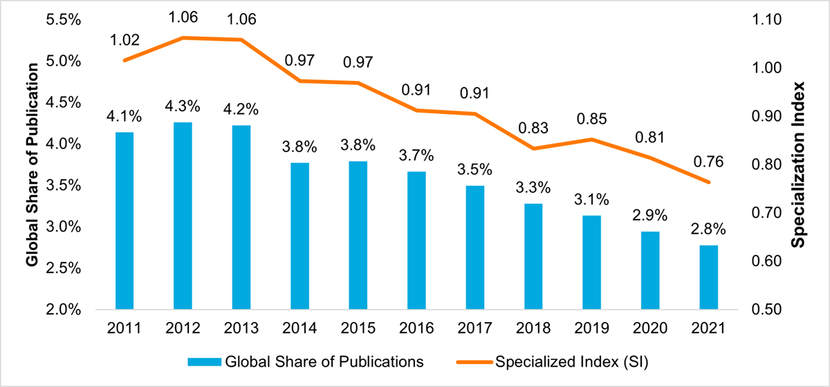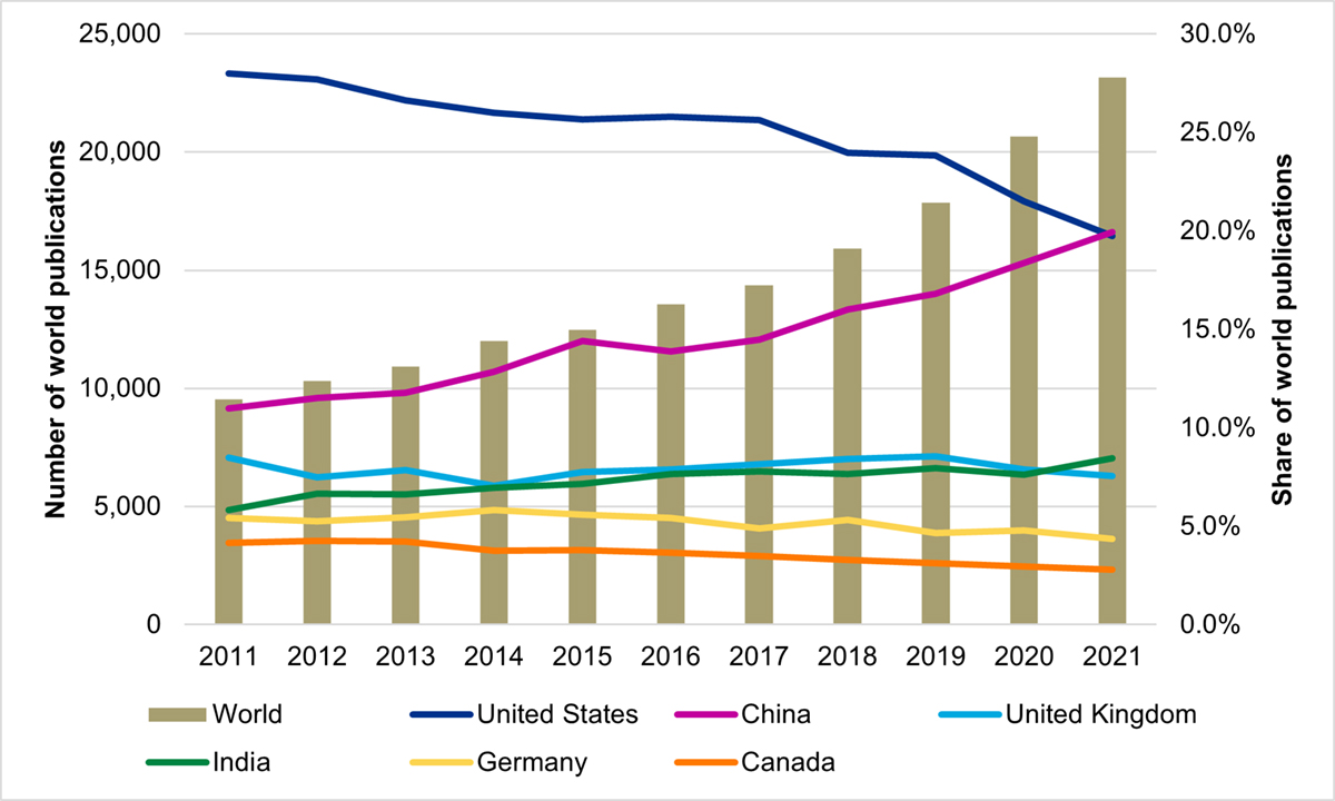 The analysis involved a list of 55 AMRI publications, covering the period of 2017-2018 to 2020- 2021. This list was used to match to records in Scopus and all 55 publications were successfully matched. Science Metrix also created a data set of publications in AMR (covering the period of 2011-12 to 2020-2021) by first defining a set of core keyphrases or specialized journals, whose specificity to AMR is very high. These keyphrases and journals were then used to capture relevant publications from Scopus to obtain seed data set. This set was then expanded by selecting specific keyphrases, queried in the title, abstract and keywords of all publications indexed in Scopus. The data set was built in consultation with CIHR Project Authority (staff from III, IPPH, IMIS and the Evaluation Unit) and the list of keyphrases was shared for their review and approval. The resulting data sets included 160,770AMR papers. In addition to the AMR publications, a portion of AMR data set of publications was also categorized by some policy objectives of interest to CIHR Project Authority. These included issues on diagnostics, policy and governance, stewardship, surveillance, transmission, and the One Health approach pertaining to AMR research. Among the overall output in AMR research, roughly 10,000 publications addressed each of the surveillance and transmission issues, close to 7,000 addressed each of the diagnostics and stewardship issues, 3,110 publications addressed the policy and governance issue, and 534 covered the One Health approach.