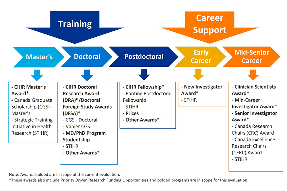The CIHR Training and Career Support Program Evaluation is thematic, and assessed the relevance, design and delivery, and performance of direct awards under two Programs: Training and Career Support (TCS) and Research in Priority Areas (RPA). Direct awards in the current evaluation refer to funding support given directly to an individual trainee or researcher through an award program (e.g., Doctoral Research Award, Career Support Award) versus funding support provided directly or indirectly through a research or training grant (e.g., Open Operating Grant, Project Grant, or Strategic Training Initiative in Health Research Grant). The evaluation covered the period from 2000-01 to 2016-17, using a range of methods and sources to triangulate evaluation findings. The scope excluded indirect awards and Tri-agency programs (although results from completed evaluations were included to contextualize findings where relevant); therefore, key findings relate to CIHR's direct awards only. The objective of this evaluation was to: inform CIHR's training strategy (the Strategic Action Plan on Training; T-SAP) and the next CIHR strategic plan; and, meet the requirements of the Treasury Board of Canada Secretariat (TBS) under the Policy on Results and the Financial Administration Act.