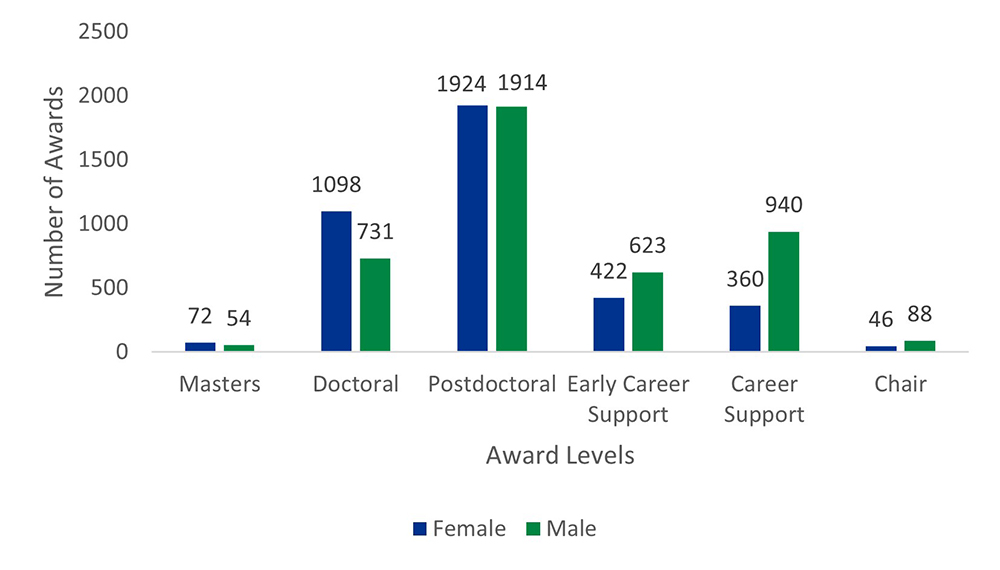 - Figure 7: Number of CIHR Training and Career Support Awards by Level and Sex (N = 8337, 2000-01 to 2015-16)
