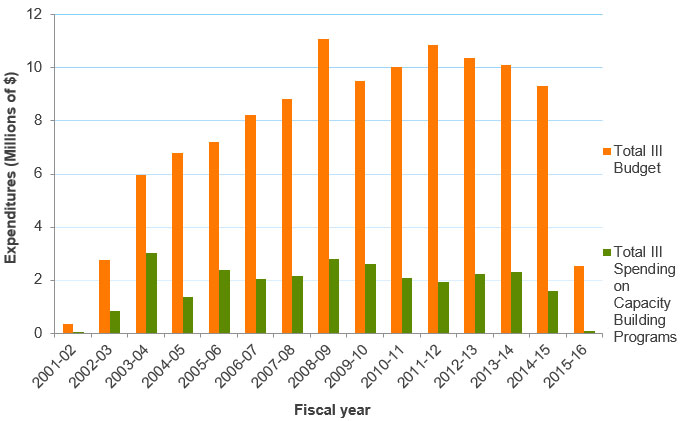From 2010 to 2016, III spent an average of 16% of its budget annually on capacity building, including investments in catalyst/pilot programs, training grants and award, and development grants (see Footnote 18 and 28% of indirect traineesFootnote 19 were funded under the III mandate (see Appendix 3).