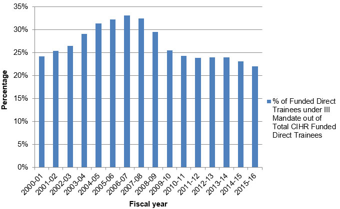 % of Funded Direct Trainees under III Mandate out of Total CIHR Funded Direct Trainees 24% 25% 27% 29% 31% 32% 33% 32% 30% 26% 24% 24% 24% 24% 23% 22%