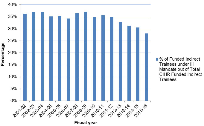 % of Funded indirect Trainees under III Mandate out of Total CIHR Funded Indirect Trainees 35% 36% 36% 34% 35% 33% 35% 36% 34% 35% 34% 32% 30% 30% 27%