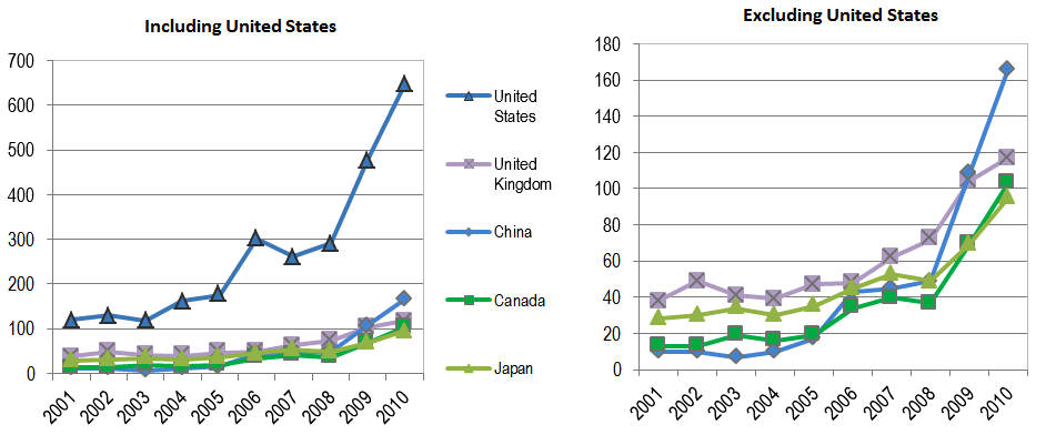 For the period from 2001 to 2010, Canada was situated in the “middle” of the ten most productive countries in the field of pandemic research with an average of 5.9% of the world’s pandemic papers; the United States led with the highest average percentage of pandemic papers published (Table 1-1). Over this period, the number of pandemic papers increased for the top five most productive countries (including Canada), and PPSRI contributed to Canada keeping pace with the United Kingdom, Japan and China (Figure 1-2).