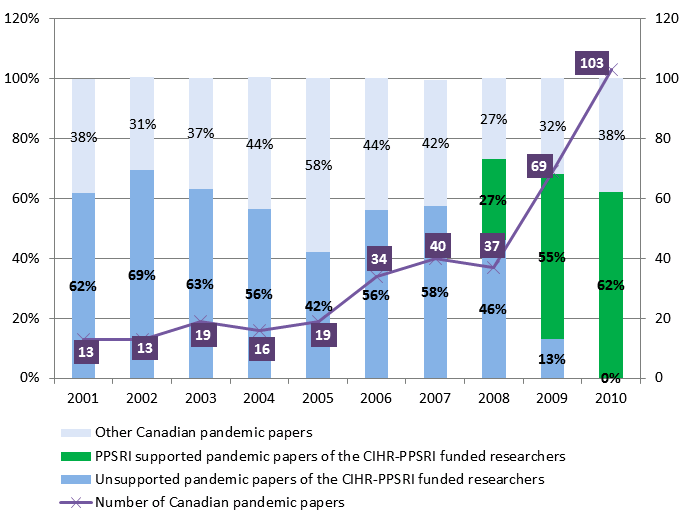 Across the world, the number of pandemic research papers has increased over the years for the period 2001-2010, and PPSRI funding contributed to Canada maintaining its middle rank within the ten most productive countries in the area of pandemics research. Over the period from 2008 to 2010, the percentage of pandemic research papers supported through PPSRI funding relative to the total of Canadian pandemic research papers increased from 27% to 62% with a steep increase in the number of pandemic papers produced in Canada from 37 to 103.