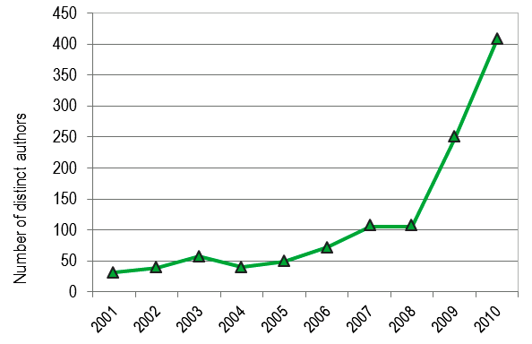 According to OST bibliometrics study, this is an estimation of the number of Canadian authors publishing in the area of pandemics using the following assumptions: when all the addresses in a given paper are those of Canadian institutions, we can assume that all the authors of this paper are Canadian, when the first address is a Canadian one, we assume that the first author is a Canadian, the address of the corresponding authors gives the specific address for at least one author on several papers. Also, several Canadian authors have been identified thanks to the publication files we already have reconstituted for many Canadian authors. Finally, for paper published in 2008 and after, the links provided by Thomson were used. It should be mentioned that these estimates were produced in order to give a rough idea of the evolution of the number of Canadian authors in the area of pandemic and that they were not fully validated. However, the methodology used here (described above) is reliable and we should emphasise that it cannot produce an overestimation. If there is an error, the only possible one is an underestimation.