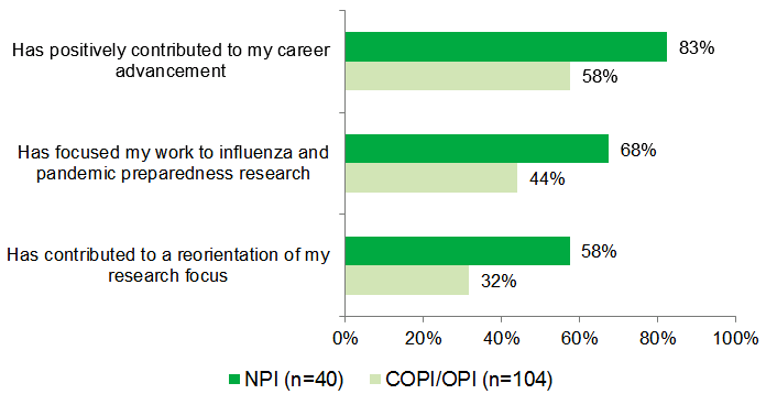 A substantial proportion of both NPIs (83%) and COPI/OPIs (58%) considered their PPSRI project to have made a positive contribution to their career. The initiative focused the work of 68% and reoriented the careers of 58% of NPIs on influenza and pandemic preparedness research.