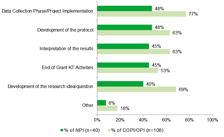 At the time of this evaluation, an increasing number of researchers funded under the PPSRI (88%), reported that they had worked on projects which included stakeholders, compared to the mid-term evaluation (66%). The most frequently reported stakeholders involved were: health system/care practitioners, study stakeholders (who were formally listed in the grant application), federal/provincial representatives and health system/care professional organizations. Generally, stakeholders were most commonly involved in data collection and the implementation of projects.