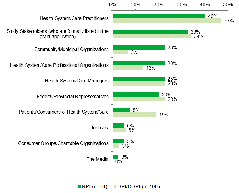 PPSRI-investigators engaged a large number, and a wide range, of knowledge users and other stakeholders in their research projects. More than half (55%) involved healthcare practitioners, 30% involved federal or provincial government representatives, 20% engaged community or municipal organizations, and 15% included patients and healthcare consumers in their studies. This engagement of various groups demonstrates a commitment to knowledge translation and the timely and effective update of their research findings.