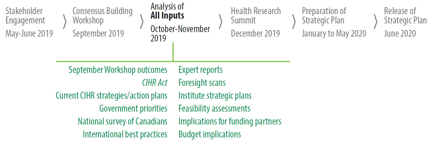 In addition to the September Workshop deliberations, CIHR will review additional information, including international best practices in science funding policy, government priorities, foresight scans, Institute Strategic Plans, existing CIHR strategies and action plans, expert reports, implications for funding partners, an assessment of the operational feasibility of options, and budget implications. Together, these inputs will be reviewed through the lens of the CIHR Act and prioritized to ensure that CIHR delivers on its legislated mandate. These efforts will inform the creation of a short list of potential priorities for CIHR, which will subsequently inform the development of a preliminary version of the Strategic Plan (to be discussed at a Health Research Summit in December 2019). It is intended that following those deliberations, the Strategic Plan will be further refined and approved by CIHR Governing Council, before being finally launched in June 2020.