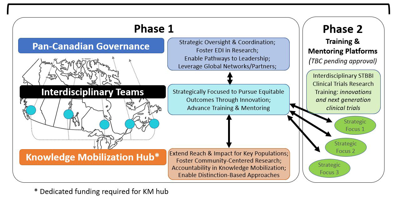 The Network funding opportunity will include two phases. The Phase 1 funding opportunity structure is designed to include pan-Canadian Governance, Interdisciplinary Clinical Trial Research Teams, and a Community-Centred Knowledge Mobilization (KM) Hub. Phase 2 will provide funding to develop multiple platforms for interdisciplinary training and mentoring that will foster the approaches and skills necessary to address the emerging needs of clinical trials research for STBBI and related conditions. It is expected that the Network will have a pan-Canadian governance structure to provide collective leadership, strategic oversight and a coordinating function for the regionally distributed Teams, the KM Hub and future Training and Mentoring platforms to be established in the Phase 2 funding opportunity. The Network governance will foster EDI in research, enable pathways to leadership for early- and mid-career researchers, and leverage demonstrate global networks and partners to optimize reach and impact. The Network must include a minimum of five (5) Interdisciplinary Clinical Trials Research Teams from different provinces and/or territories, each with representation in governance and the KM Hub to provide equitably distributed national research infrastructure. The Interdisciplinary Teams will be strategically focused to pursue equitable outcomes through innovation and will be responsible for advancing training and mentoring within the Network. The KM Hub will extend the reach and impact of the Network for key populations, foster community-centred research, provide accountability in knowledge mobilization and enable distinction-based approaches to be incorporated in Network activities and research. The Phase 2 funding opportunity, which will be launched pending approval, will support training and mentoring platforms and will include funding for multiple interdisciplinary STBBI clinical trials research training platforms connecting to the strategic priorities of the teams. The training and mentoring platforms are intended to support innovations and support the next generation of clinical trials.