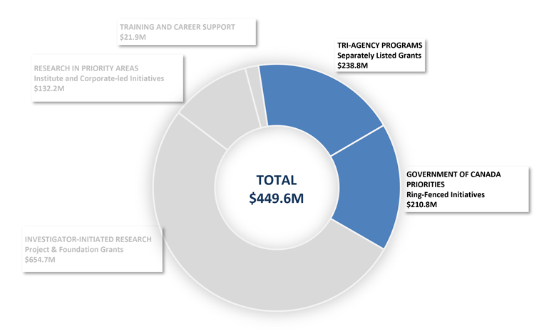As the name suggests, the Tri-Agency Programs funding envelope (approximately 53% of non-discretionary funding, and approximately 19% of the total CIHR G&A budget) supports tri-agency programs such as the Canada Research Chairs, Vanier Canada Graduate Scholarships, and Canada First Research Excellence Fund – among many others. These programs are designed to support all areas of research through collaborations between the tri-agencies—the Natural Sciences and Engineering Research Council (NSERC), the Social Sciences and Humanities Research Council (SSHRC), and CIHR—with each agency administering the funding for projects relevant to their specific mandate. For example, funding for a Canada Research Chair awarded to a researcher working in an area of health research would be managed and disbursed by CIHR.