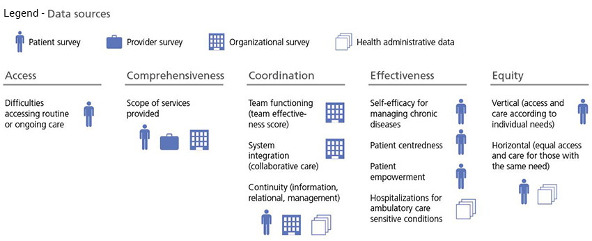 Following a review of existing primary health care indicators (e.g. CIHI) and the research protocols for each of 12 Teams, the working group identified, through a consensus building process, several dimensions important to primary health care and related constructs (e.g. multimorbidity, demographic characteristics). This group has agreed upon common measures that use publicly available and previously validated data collection instruments (e.g. patient and provider surveys). While not all dimensions will be measured by all teams, 75% coverage for agreed upon dimensions across all teams has been achieved. Data collection using patient and provider/organizational self-report and administrative data is currently underway.
