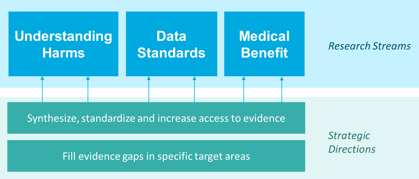 The ICRS will support three parallel streams of research: Understanding Harms, Data Standards, and Medical Benefit. Underlying each of these streams are research activities, which will serve to synthesize, standardize and increase access to evidence, and fill in evidence gaps in specific target areas.