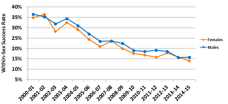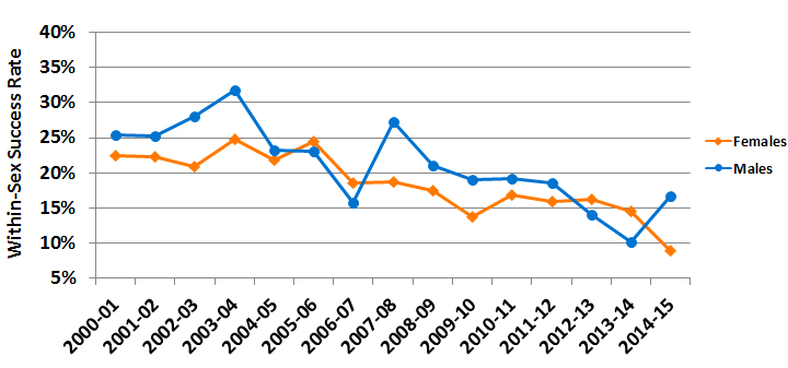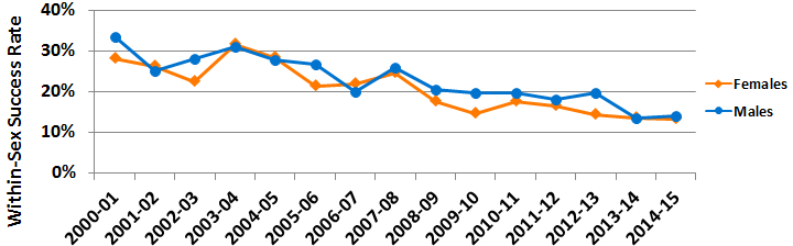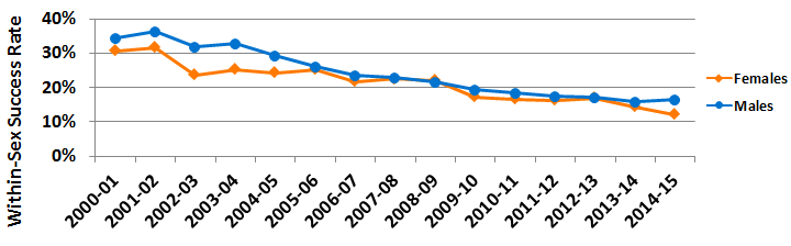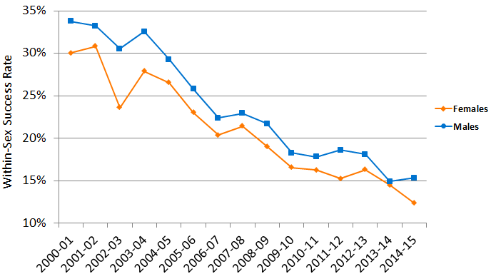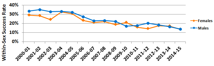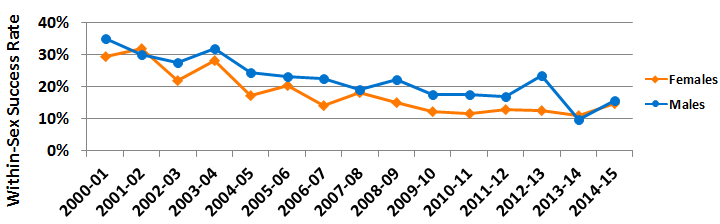 Methods: The data in this section represents the competition results of CIHR’s Open Operating Grant Program from 2000/01 to 2014/15. Please note that, unless specified, the data is presented as within-sex success rates to take into account the proportions of applications received from males and females.
