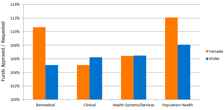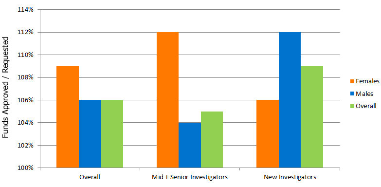 NB: The percent of requested CIHR funding was calculated using the baseline amount that CIHR calculated for each applicant as the "amount requested". Applicants were told that if they could justify a budget increase over their calculated baseline, they may be awarded an increase. For this reason, the % requested tended to exceed 100% because the amount awarded was often greater than the calculated baseline amount.